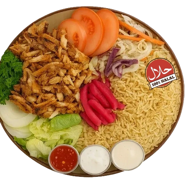 Our Shawarma Plate comes with tender, marinated chicken ,beef or mixed shawarma, served with your choice of sides like rice, salad, or fries, and topped with fresh veggies and homemade sauces.